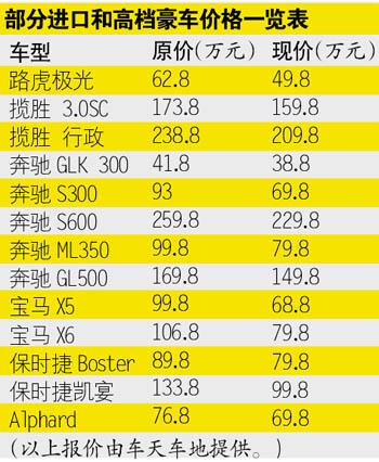 记者从广州车天车地、锦龙奥迪、奔驰仁孚等展厅了解到,一些热销豪车让利动辄十余万元以上,一些入门级豪车亦有数万元优惠。如奥迪A4L近期优惠高达2.5万~4万元,Q3优惠4万元左右,尤其沃尔沃、雷克萨斯全系车型都有较大让利。在SUV市场备受追捧的路虎极光、揽胜等车型近期也有10多万元以上的优惠,奔驰ML350优惠也高达20万元。豪车领头的“金九银十”价格战,让中低端合资品牌更难“HOLD住”阵脚。在十一期间的广日白云国际车展上,消费者可以前往车展现场低价淘车!(记者邓莉)