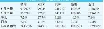 尽管处于传统淡季,但除部分日系车企外,8月份的国内车市整体仍呈现两位数的高增长。全国乘用车市场信息联席会上周公布的数据显示,8月份国内乘用车产量为138.8万辆,环比和同比分别增长7.1%和13.2%;销量为131.5万辆,环比和同比分别增长10.4和13.3%。