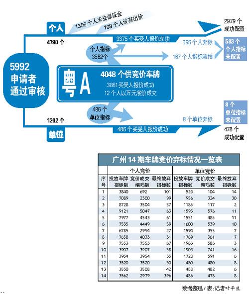 一边是平均成交价高达30802元的历史最高位,另一边是12个填报1万元底价的申请者全部幸运得牌。备受争议的广州第14期个人车牌竞价配置活动结束两周后,本次竞价的最后结果昨天揭晓——竞价成功的3861位买受人中,共有包括396位个人、8个单位在内的404个买受人未缴交成交款,放弃了已到手的车牌指标。这个数据也创造了广州车牌竞价14个月以来的最高纪录。