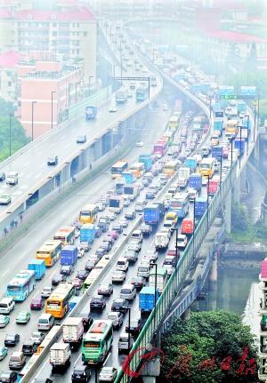 上班高峰期,内环路段数公里的塞车长龙缓慢移动。记者顾展旭 摄