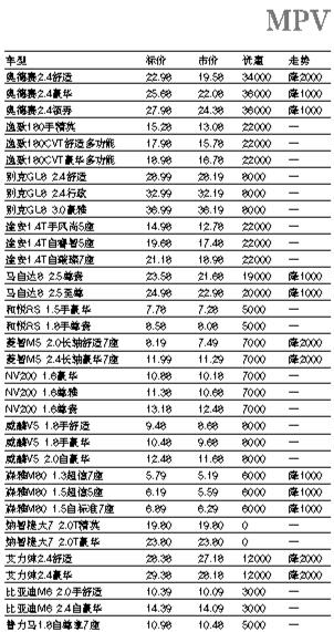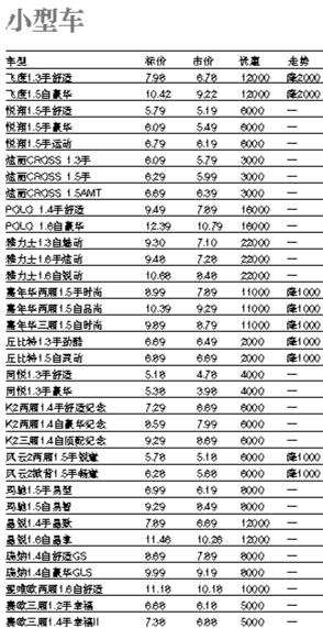 采样地点:新亚运村汽车交易市场、北方汽车交易市场、部分4S店及二、三级经销商处。表中所列标价为各款车型4S店公开的指导价格或销售价格,所列市价为各款车型二、三级经销商或部分4S店成交价格。