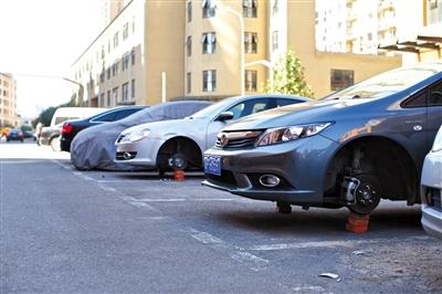 昨日,十里河弘善家园小区一夜之间9辆车轮胎被偷。新京报记者 周岗峰 摄