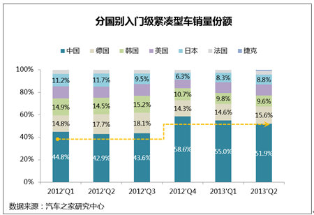 从2012Q1年至2013Q2,入门型紧凑型车分国别份额交替变换,自主品牌不断发力入门级紧凑型车细分市场领域,销量份额也稳定在五成以上。