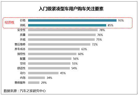 从汽车之家研究中心的调查数据来看,预购车型为入门级车用户购车关注要素前五依次排列为价格、油耗、安全、质量、外观,关系到购车成本和用车成本的两个要素赫位列第一和第二位,而且售后维修和养车成本也位列第六和第七位。由此可知,经济性是入门级车消费者的购车最基本条件,其次消费者会权衡车辆的质量、外观等因素。但从首次购车消费者的购车心理来说,价格区间只是他们锁定预购车辆的第一环节,在进入确定购买哪款车的环节时,车辆的其它因素就成为左右他们购买的关键了,所以经济性并不能成为左右消费者购车决策的利器,踏踏实实的提高产品竞争力才是赢得市场的关键。