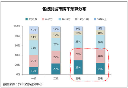 从汽车之家研究中心的调查数据来看,一二线城市消费者购车预算分布在10万以下比重大幅低于三四线城市。三四级城市用户选择入门级车的比例更高,加之三四线城市汽车消费者数量众多,几乎不存在交通、摇号和停车难的用车不利因素,所以三四线城市消费者的入门级紧凑型车消费潜力更加巨大。