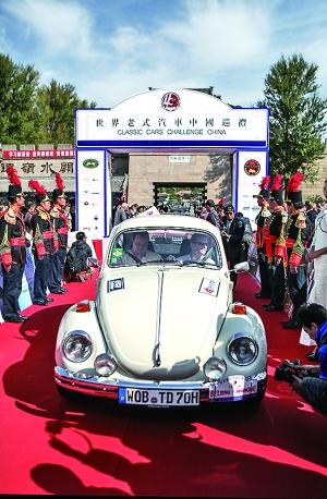 2013世界老式汽车中国巡礼赛,10月12日从北京出发,经天津、青岛、连云港、南京、杭州,并于10月18日抵达上海。大众集团(中国)总裁兼CEO海兹曼教授驾驶着一辆1972年的大甲壳虫从北京抵达天津。(记者 和玲)