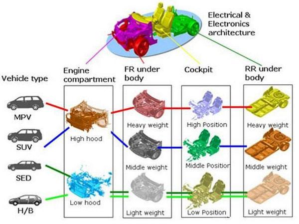 由于采用了宽松的定制形式,不同的模块可以根据不同需要设计成不同的尺寸,设计师只要把这些模块组合在一起,就能搭配出多种尺寸的车型。