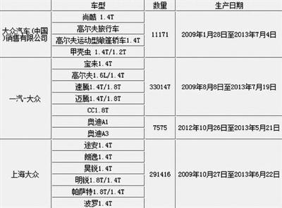 值得注意的是,此次召回的车辆,和3月20日的那次召回,在车型和生产日期上存在部分重合。例如,大众汽车(中国)销售有限公司进口的2009年1月28日到2011年9月生产的尚酷1.4T、高尔夫旅行车等;一汽-大众汽车有限公司2009年8月8日至2012年1月生产的速腾1.4T、迈腾1.4T、CC1.8T;上海大众汽车有限公司2009年10月27日至2012年5月23日及2012年12月10日至2013年3月2日生产的途安1.4T、朗逸1.4T、明锐1.8T、昊锐1.4T等。