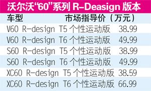 三款新款60系车型的R-Design版本也借广州车展契机上市。R-Design 系列拥有崭新运动外观、注重动态驾驶的底盘、标配全新运动型坐椅。其中T6车型在选装北极星(Polestar)软件后,功率提升至329马力,而 S60 R-Design的 T6车型百公里加速仅为5.9秒。(记者龙嘉丽)