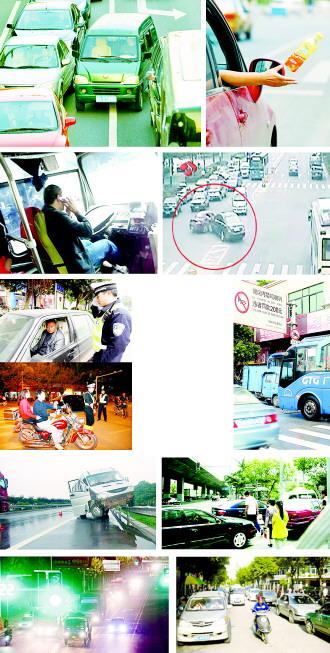 图①为随意变道。图②为车窗丢物。图③为驾车接打手机。图④为开斗气车酿事故。图⑤为交警处罚不系安全带和不戴头盔行为。图⑥为城区禁止鸣笛。图⑦为雨天开车不减速造成事故。图⑧为右转车不礼让斑马线。图⑨为夜间滥用远光灯。图⑩为车辆乱停乱放。