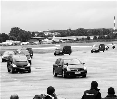 法国公务车更倾向于选择本国汽车品牌,以体现本国形象。图为2011年巴黎航展上,时任法国总统萨科齐坐的就是法国生产的雷诺汽车。 记者 李红光摄