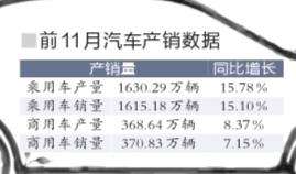 据中汽协统计,1至11月,我国汽车生产和销售规模分别为1998.93万辆和1986.01万辆,同比分别增长14.34%和13.53%。中国汽车工业协会秘书长董扬表示,今年全年国产汽车产销量均有望达到2100万辆的规模。中汽协方面分析,今年汽车产销高速增长主要源于乘用车市场需求旺盛,SUV车型和MPV车型的增长速度远高于行业水平。