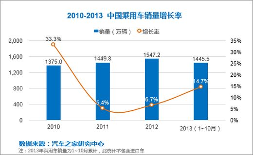 2013年1~10月,中国乘用车(不含进口)累计销量达到1445.5万辆,同比增长14.7%。如果说2011和2012年中国汽车销量属于微增长的话,那么截止到2013年10月,中国乘用车的销量增幅已经越过了“微增长”的范畴,预计2013整年年中国乘用车销量增长率将达双位数。