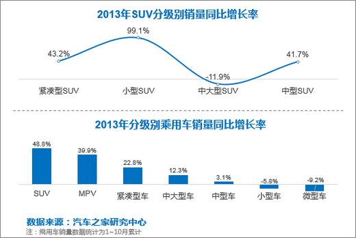 从2013年1~10月乘用车销量统计数量来看,SUV级别内细分市场中小型SUV销量同比增幅最高,达99.1%%,对SUV整体销量增长的贡献率最高。从2013年分级别销量的同比增长率来看,SUV市场销量同比提升48.8%位居各级别之首,其次为MPV(+39.9%)和紧凑型车(+22.8%)。
