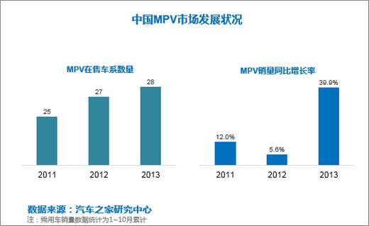 从MPV近三年来的销量发展趋势来看,在MPV车系数量没有明显增长的情况下,2013年MPV的销量增长率却有了大幅提升(+39.9%)。MPV销量的增长进一步的表明了中国人的汽车消费观念正在不断成熟,MPV销量的增幅似乎能证明这一趋势。未来,随着MPV车型的不断丰富,市场前景将会更加乐观。