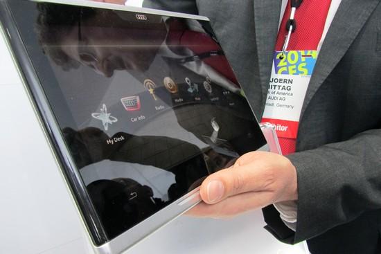 奥迪是通过一个跟苹果IPAD外形相似的平板电脑,名字叫做AUDI SMAT DISPLAY。在有网络的前提下,车主可以将AUDI SMArT DISPLAY拿走,在办公室、家里、商场里就可以控制自己的车辆。AUDI SMART DISPLAY在零上80摄氏度高温下或者零下40摄氏度的严寒下都可以使用,但是需要注意的是,AUDI SMART DISPLAY一次性离开汽车的时间不能超过30天。