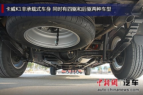卡威K1共有汽油、柴油两种动力可选。汽油版采用三菱4G69S4N发动机,排量2.4L,最大功率105kW,峰值扭矩200Nm,国IV排放标准;柴油版则采用大柴CA4D32高压共轨柴油发动机,排量3.2L,最大功率仅为79kW,但峰值扭矩达到了249Nm,依然是国IV排放标准。K1采用三菱底盘技术,标配了ABS+EBD,提高皮卡的安全性。