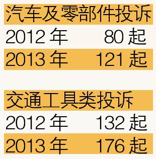 记者从中山市消费者委员会了解到,2012年交通工具类投诉为132起,其中汽车及零部件为80起;2013年交通工具类的投诉为176起,其中汽车及零部件为121起。值得注意的是,从2013年汽车三包实行之后,即第四季度的交通工具类的投诉为42起,其中汽车及零部件为23起。