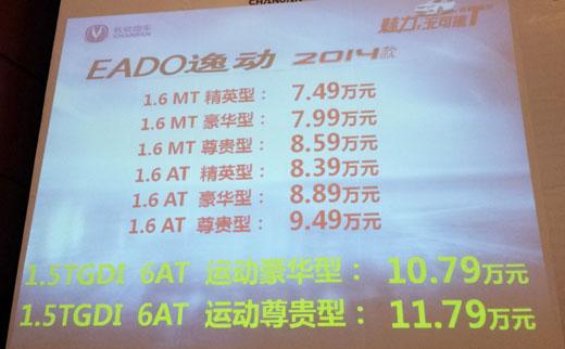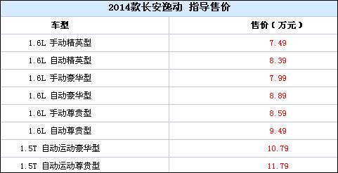 1月14日,长安汽车2014款逸动在重庆正式上市。本次总共发布了8款逸动2014款车型,其中1.6L车型共6款,同时新增了两款1.5T车型,售价如下:
