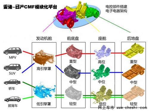 雷诺-日产的CMF模块化平台英文全称Common Module Family,其将汽车由四个模块组成,分别是发动机舱+座舱+前底盘+后底盘。在电控部件搭建起电子电气架构之后,每个模块可根据车型的重量等要素进行调整。设计师再将模块有机结合,制造出定位与级别各异的车型和车系。