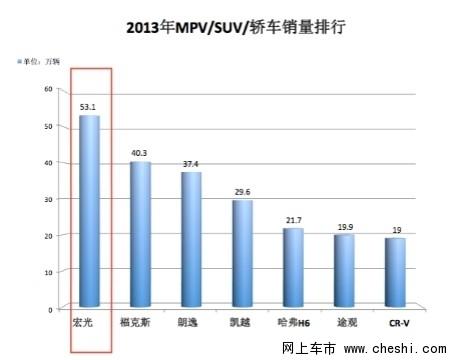 2013年乘用车销售最好的车型?福克斯?朗逸?……都不是,而是异军突起的五菱宏光,它以领先第二名13万的优势,一骑绝尘成为2013年乘用车市场当之无愧的冠军。作为国内最畅销的车型,五菱宏光在上市后短短3年时间内,市场保有量就突破100万辆,成为国内增长最快的车型,并占据整个MPV市场四成的份额。继11月销量突破6万大关后,12月再创新高,单月销售新车超过7.5万辆,屡屡刷新中国乘用车销量榜单。