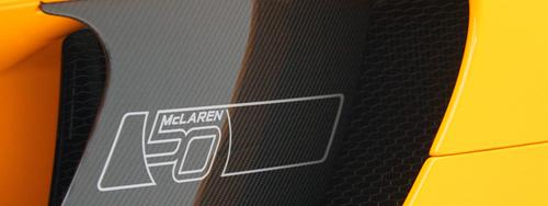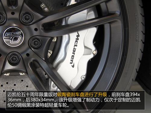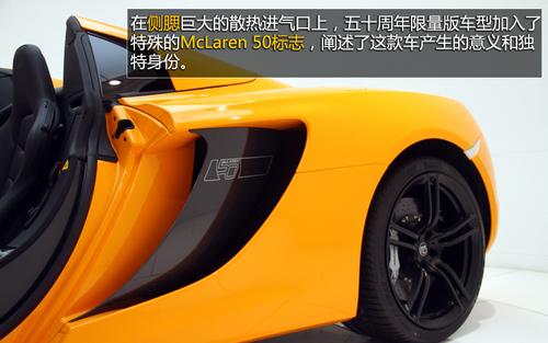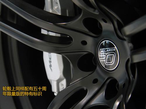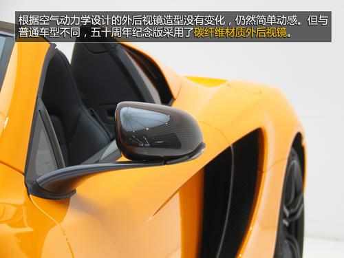 在车身侧面,五十周年限量版车型采用了碳纤维材质的外后视镜,并且在侧面巨大的散热进气口上加入了限量版车型堵头的“McLaren 50”限量铭牌。
