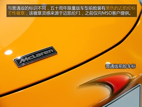 在前脸上,五十周年限量版车型与普通版车型最大的不同就是搭载了与迈凯伦F1一致的黑色车标,同时在进气口和保险杠方面也进行了全新设计,加入了大量的碳纤维材质,并完美结合的空气动力学原理,诠释了迈凯伦的轻量化设计理念。