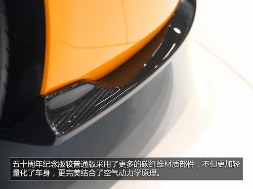 五十周年限量版的尾部基本没有变化,但是采用了碳纤维纸质的尾翼,这点是一大亮点。在轮毂方面,五十周年限量版采用了全新的更加轻量化的双五辐轮毂,造型动感,另外对制动系统也进行了改变,增强了制动力。