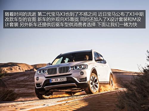 距离第二代宝马X3在国内的上市时间已经将近4年,按照德国车换代的习惯,X3已经到了中期改款的时间。近日,宝马公布了X3中期改款车型的官方照片,新车的外观采用了X系列最新的家族样式,并且在配置方面也有一定的提升,预计新车将在今年年底进入国内。