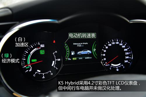 K5 Hybrid的内饰布局和普通版车型相同,仅仅是在一些细节上做了改变,为了更家突出环保理念。改变最大的就是仪表盘,混合动力专属4.2"彩色TFT LCD豪华仪表盘是混动版K5的标准配置,和大多数混动车一样,显示的内容很丰富,发动机与电动机之间的工作状态也可以一目了然的观察到。