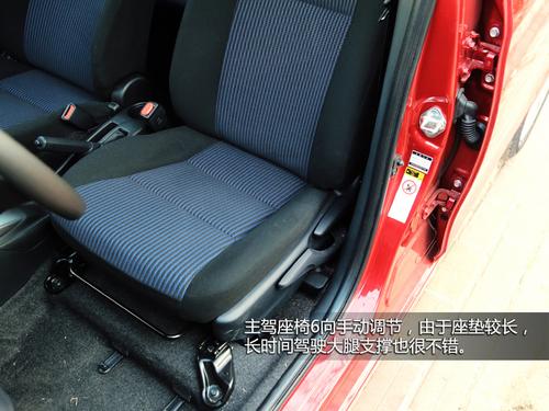 主驾座椅6向手动调节,由于座垫较长,长时间驾驶大腿支撑也很不错。身高1米8的体验者将驾驶座调至最低,可以获得不错的头部空间。只是座椅安装位置本身较高而转向柱很低,身材较高的驾驶者会觉得像是在开SUV。