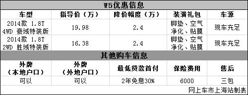 参与互动(0)日前网上车市上海站从上海海博君亿汽车销售有限公司了解到,目前该店W5优惠出售,具体信息见下表: