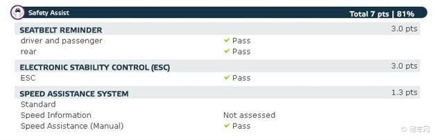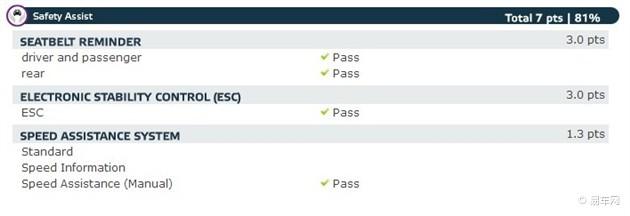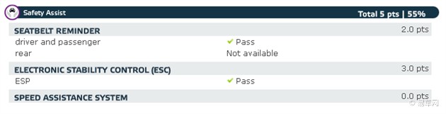 翼搏全系标配电子稳定控制系统,故而拿到3分。两个前排座椅设有安全带未系提示功能,不过后排并没有该功能,因此只得2分。由于没有限速装置,因此翼博此项得分为0,总得分5分。