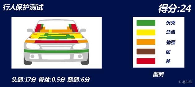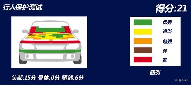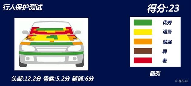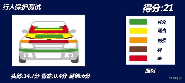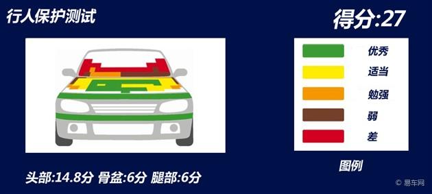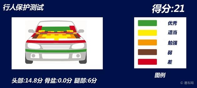 车辆前保险杠对行人腿部的保护到位,因此腿部获得了优秀的成绩。前风挡玻璃的大部分区域对头部没有大的威胁,但玻璃两侧的情况就没有那么乐观了(差评)。此外,发动机盖前端的评价也很低,有可能对行人的骨盆造成严重的伤害。