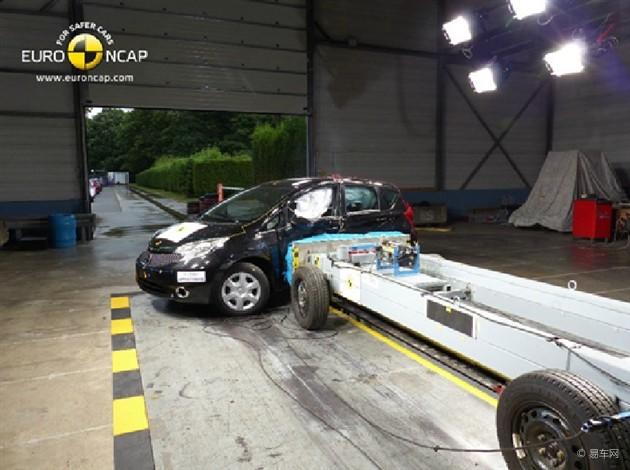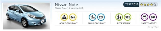 正面碰撞中车内乘员受保护的情况基本正常,大腿虽然受到的冲击较大,但还在可接受的范围内。日产Note在侧面和更苛刻的侧面柱碰测试中表现的不错,在这种测试中胸部是较容易受伤的部位,Note在这两个项目上都获得了良好的成绩。