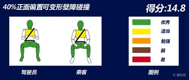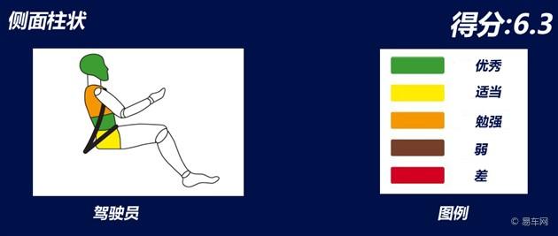 而在侧面柱状时,由于受力点更加集中,所以造成了更为明显的假人胸部伤害。测试结果也由“适当”降低至“勉强”。该测试主要考察的是车子B柱强度的表现。