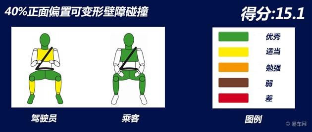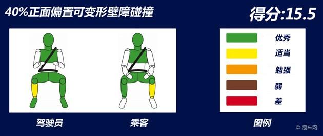 通过成人的安全碰撞可以看出,前排乘员的头部和腿部均获得了绿色(GOOD)优秀成绩,这归功于整体车头强度的分布,当然也有前排安全气囊、头部气帘以及膝部气囊的功劳。而这两部分的受伤程度则直接影响着驾驶员是否能在第一时间脱离车祸现场。