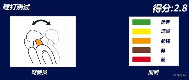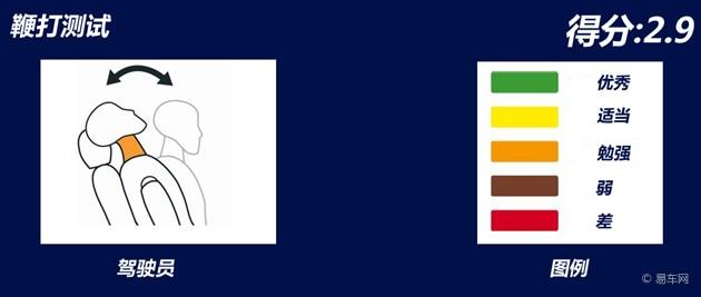 在鞭打测试中,前排座椅和头枕对于前排乘员颈椎的保护有明显不足,从图中颜色看属于中等级别,有受伤的危险。
