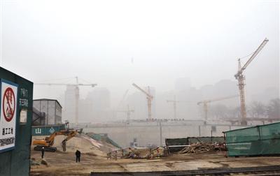 昨日,国贸央视新址旁的工地能见度很低,工人们在雾霾中施工。记者 高玮 摄