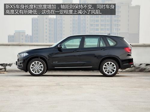 新X5车身长度和宽度增加,轴距则保持不变。同时车身高度又有所降低,让这款SUV看上去显得更加修长,同时这也在一定程度上减小了风阻。实拍车型采用的是固特异Eagle F1非对称花纹轮胎,规格为255/50 R19。