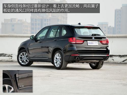 侧面线条经过重新设计,看上去更加流畅,翼子板处的通风口同样具有降低风阻的作用。新的家族式尾灯造型时尚,辨识度高,采用LED光源,效果出众。新X5的尾门仍然采用上下分开的开启方式,与老款X5的厚重感相比,新X5的尾部造型更加犀利,整体上与X3非常相似。