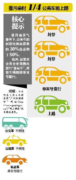 广州如果遭遇重污染天气,临时交通管理措施究竟如何进行呢?昨日,广州空气重污染期间实施临时交通管理措施在市环保局网站上公开征求意见,其中最大亮点在于,重污染天气条件下,公务车的封存比例由原来的30%提高到了50%。此外,还要求全天全市范围内禁行“黄标车”,所有车辆按照单双号限行。