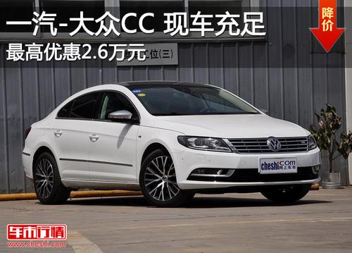 2013年6月29日,一汽-大众2013款CC正式上市。此次上市的新车属于中期改款车型,外观方面融入了大众家族式的设计元素,同时在配置方面也进行了一定的升级。近期,编辑从一汽-大众北京经销商处获悉,2013款CC现车充足,最高直降2.6万元。具体如下: