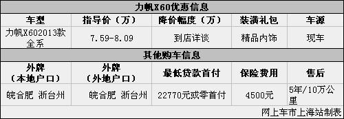 参与互动(0)日前网上车市上海站从上海源烨汽车销售有限公司了解到,目前该店力帆X60最低贷款零首付,具体信息见下表: