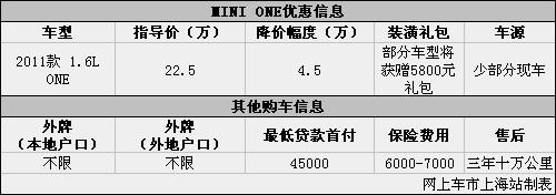 上海:2011款MINI ONE优惠4.5万元 送礼包
