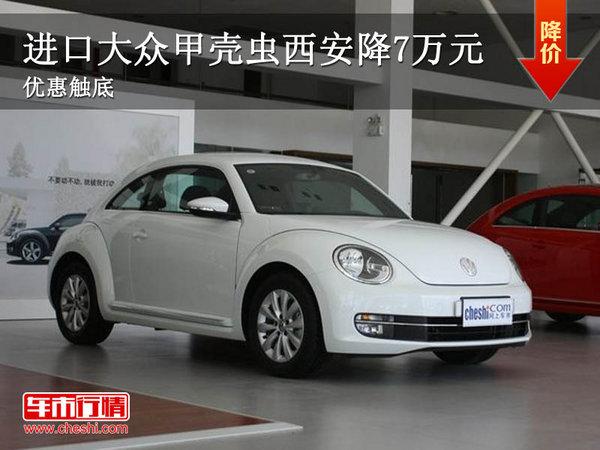 近日,据网上车市西安分站编辑从陕西地区进口大众4S店获悉,现在购买甲壳虫最高将可获得7万元的现金优惠。有意者不妨致电经销商或者到店了解更多信息。