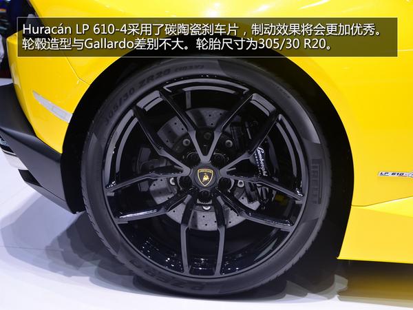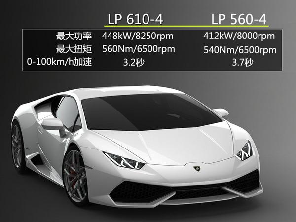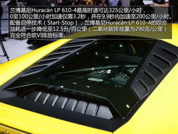 兰博基尼Huracán LP 610-4最高时速可达325公里/小时,0至100公里/小时加速仅需3.2秒,并在9.9秒内加速至200公里/小时。配备启停技术(Start-Stop),兰博基尼Huracán LP 610-4的综合油耗进一步降低至12.5升/百公里(二氧化碳排放量为290克/公里),完全符合欧VI排放标准。