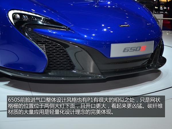 650S前脸进气口整体设计风格也有P1有很大的相似之处,只是网状格栅的位置位于两侧大灯下面,且开口更大,看起来更凶猛。碳纤维材质的大量应用是轻量化设计理念的完美体现。650S采用了蝴蝶式车门,将个性彰显得淋漓尽致。650S的螺旋弹簧的硬度增强了22%,调高减震阻尼和更换减震衬套,同时还对底盘进行了全面调校,包括改善制动效能,调整ABS和ESP的介入时间,使得其性能叫12C更优秀。