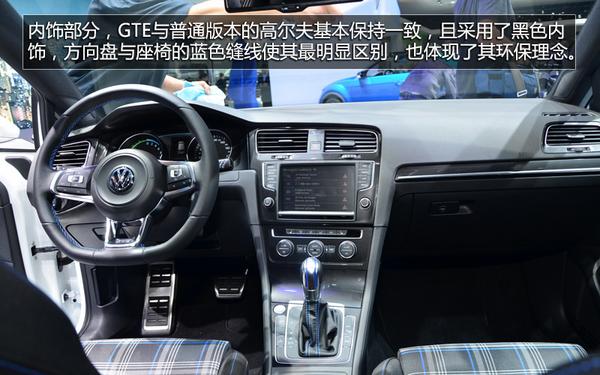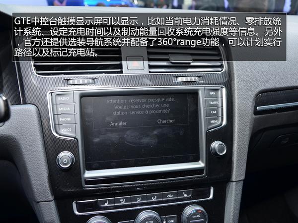 内饰部分,GTE与普通版本的高尔夫基本保持一致,且采用了黑色内饰,方向盘与座椅的蓝色缝线使其最明显区别,也体现了其环保理念。中控台触摸显示屏可以显示,比如当前电力消耗情况、零排放统计系统、设定充电时间以及制动能量回收系统充电强度等信息。另外,官方还提供选装导航系统并配备了360°range功能,可以计划实行路径以及标记充电站。