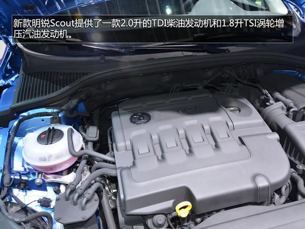 明锐Scout在动力配置方面会只有提供1.8TSI以及2.0TDI两个版本,变速箱方面则可以选择6速手动或者7速DSG变速箱。特别是1.8TSI版本,其发动机进行了升级换代,最大功率从118千瓦提升至132千瓦,最大扭矩达到250牛米。(许振宇)